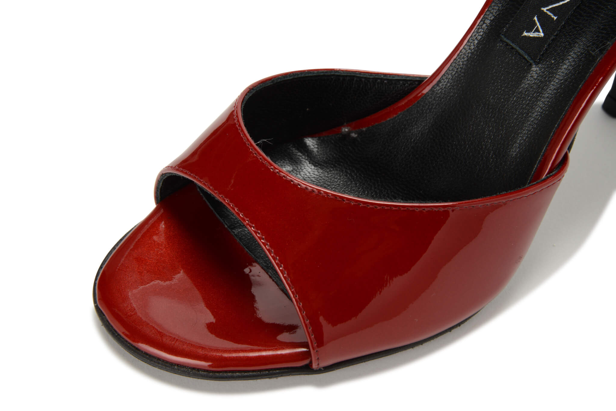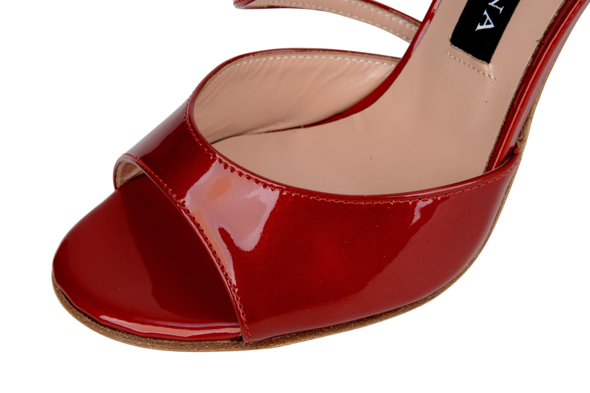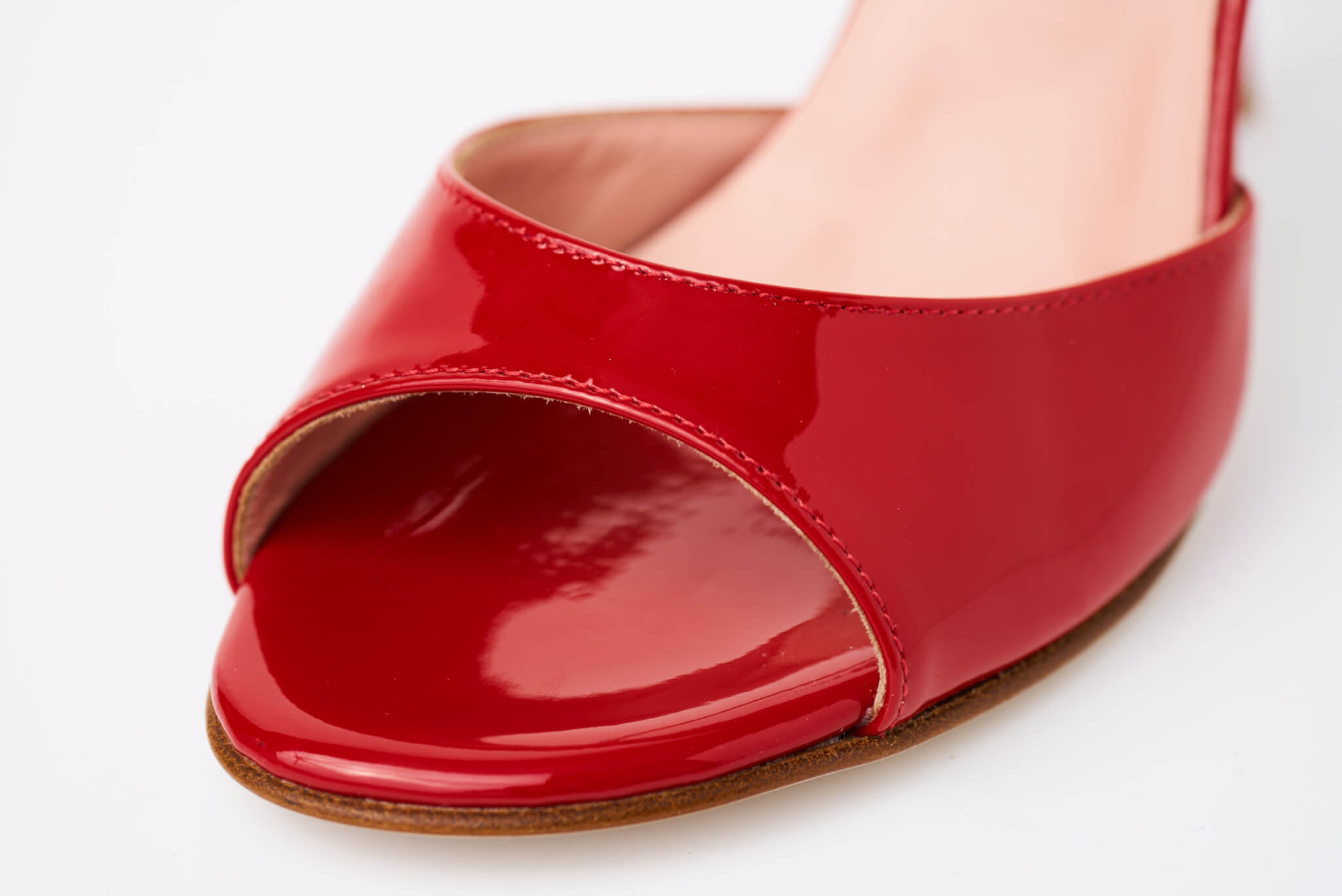 Red Patent Leather, Open toe model with Closed heel cage, Single diagonal strap, Red stiletto heel and fine leather sole.