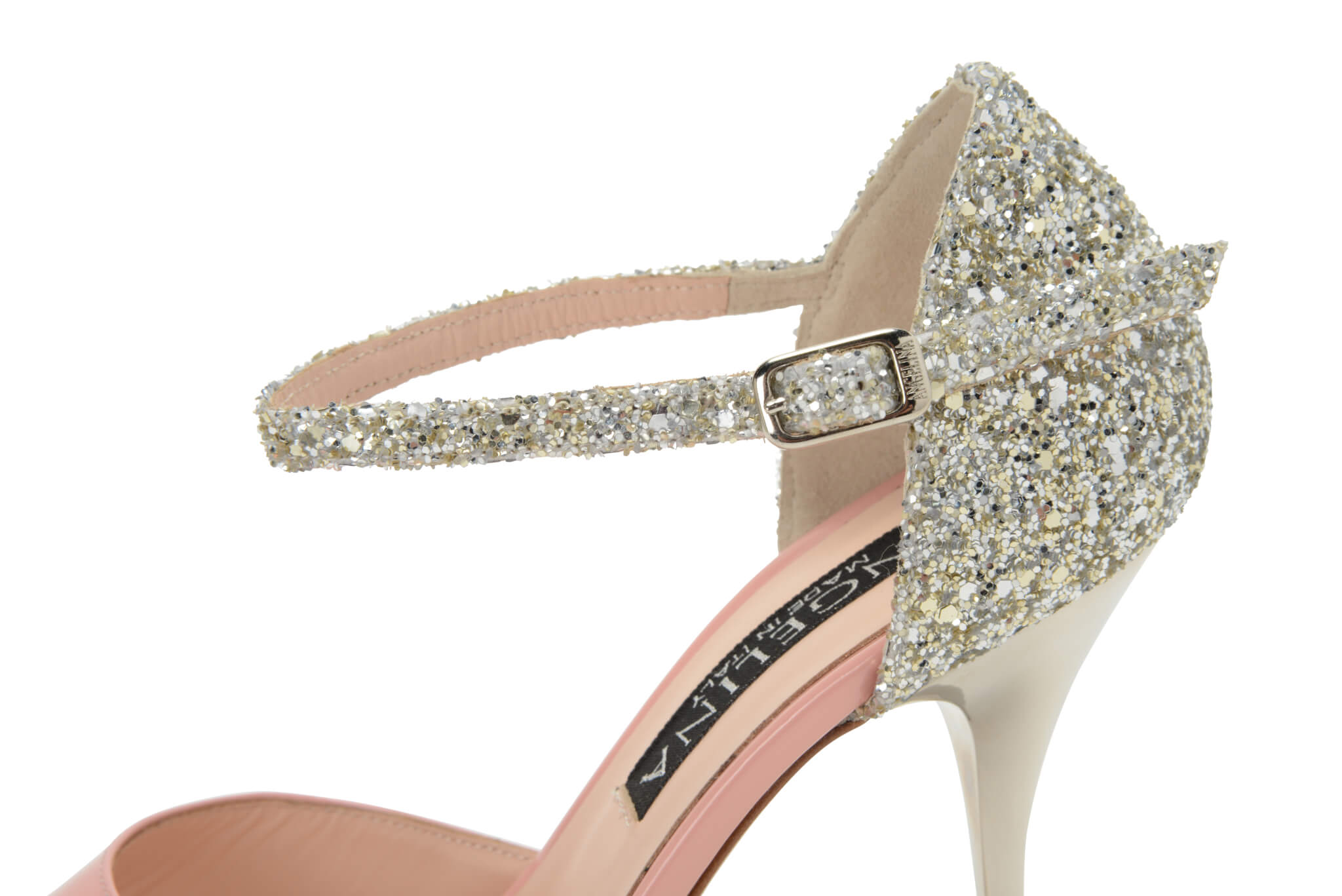 Silver glitter, combined with Pink Patent leather, Open toe model with Cosed heel cage, Single ankle strap, Shinny silver stiletto heel and fine leather sole.