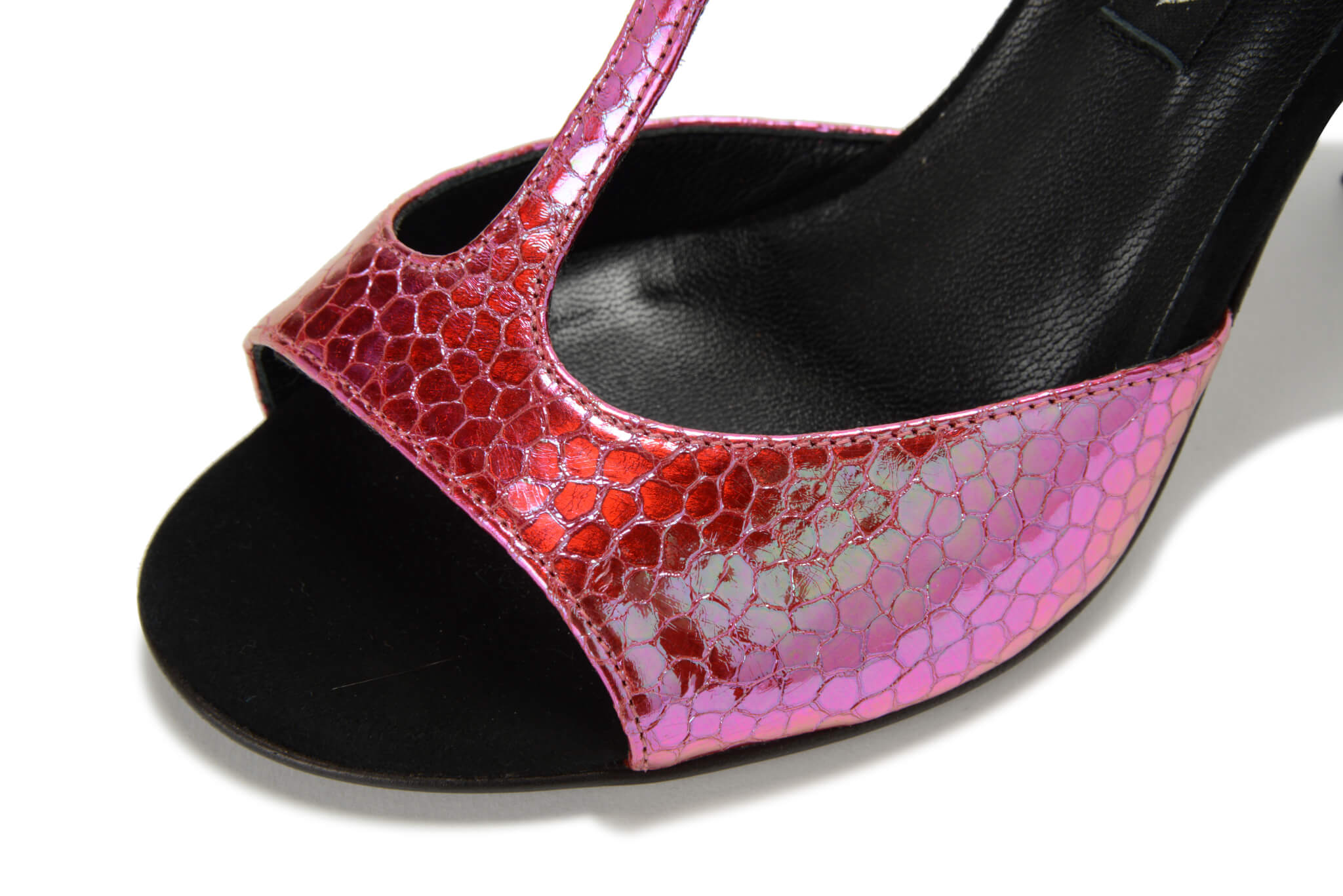 Metallic fuxia printed leather, combined with black leather, Open toe model with Open heel cage, T strap, Black stiletto heel and fine leather sole.