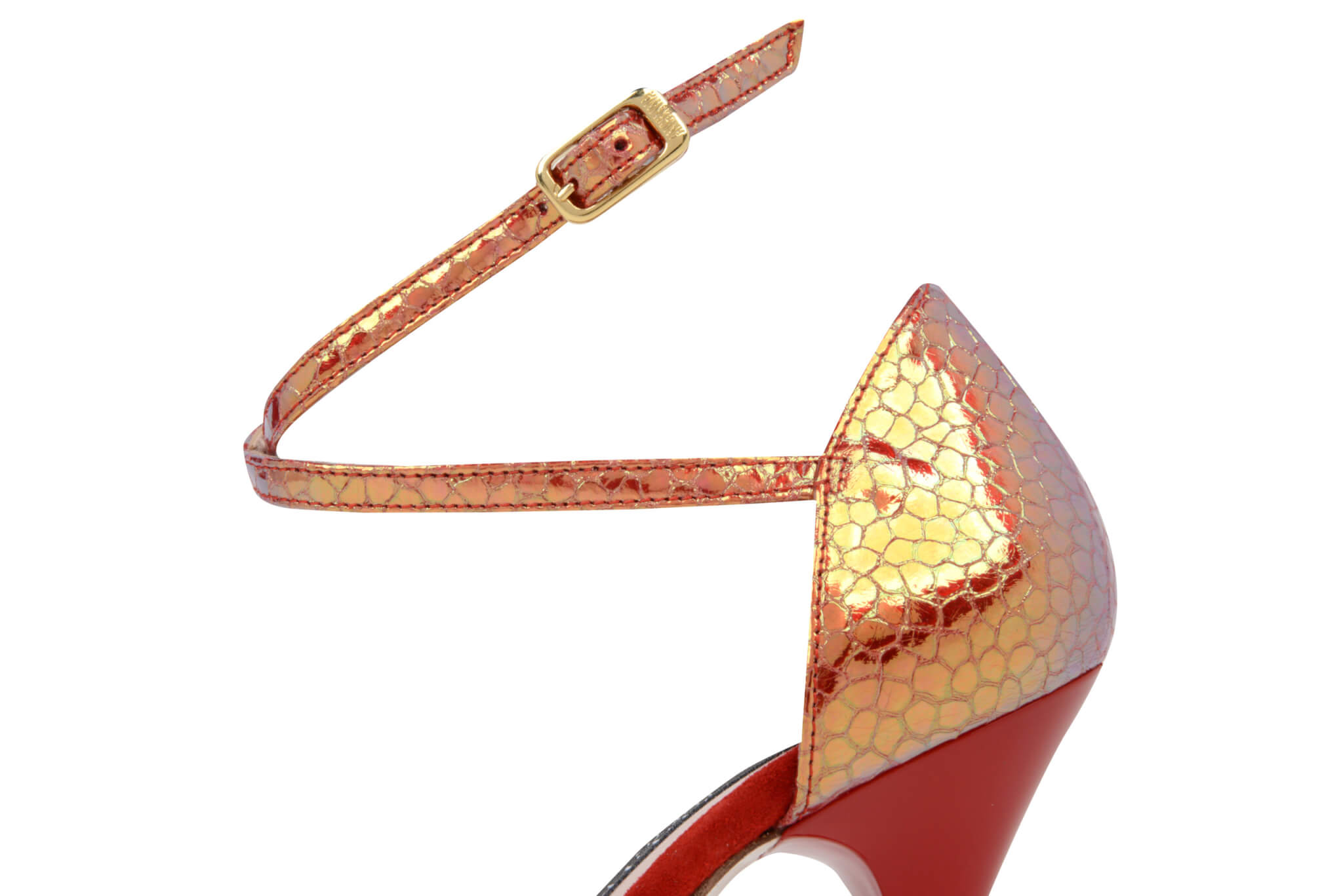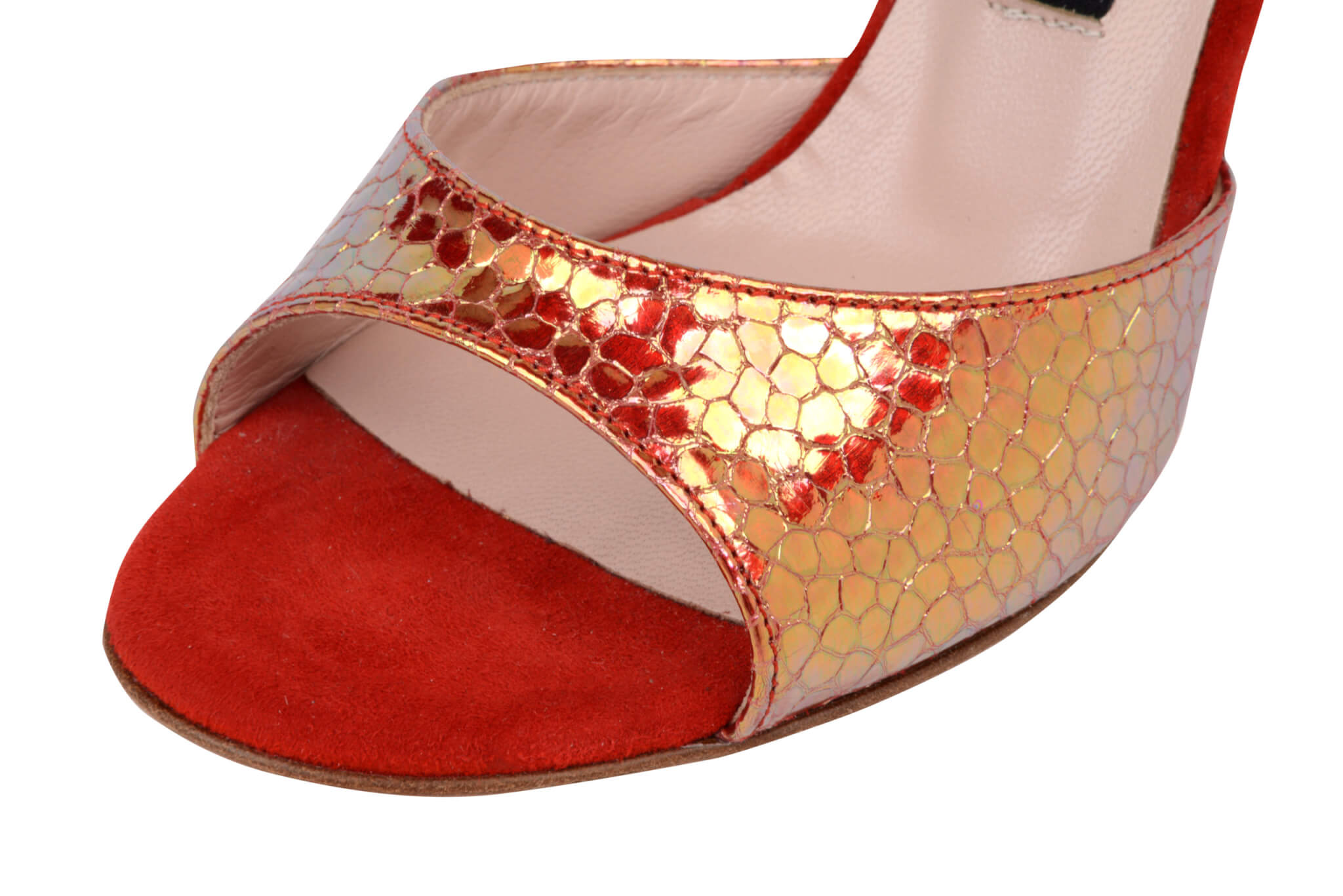 Metallic red printed leather, Open toe model with Cosed heel cage, Double ankle strap, Red stiletto heel and fine leather sole.