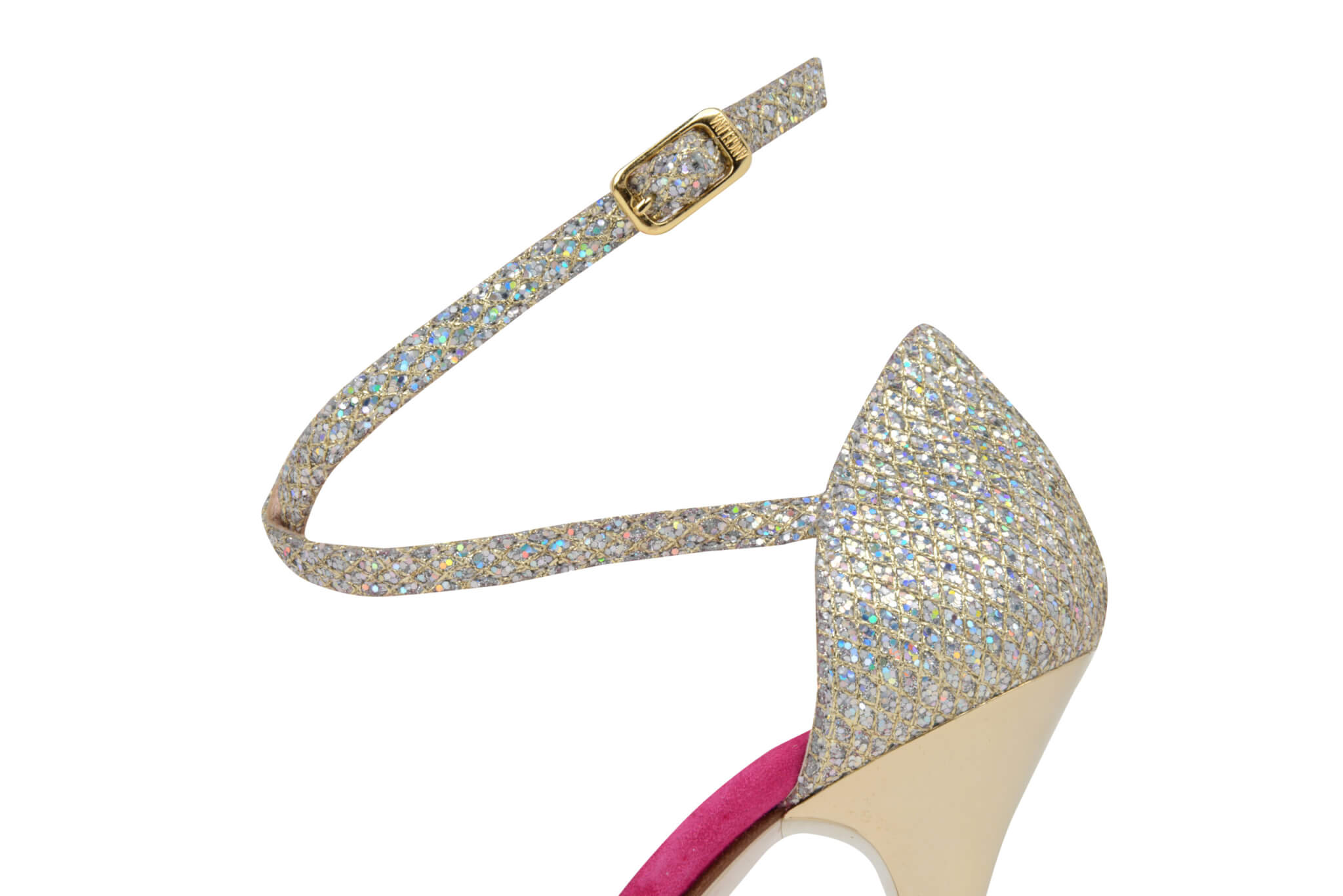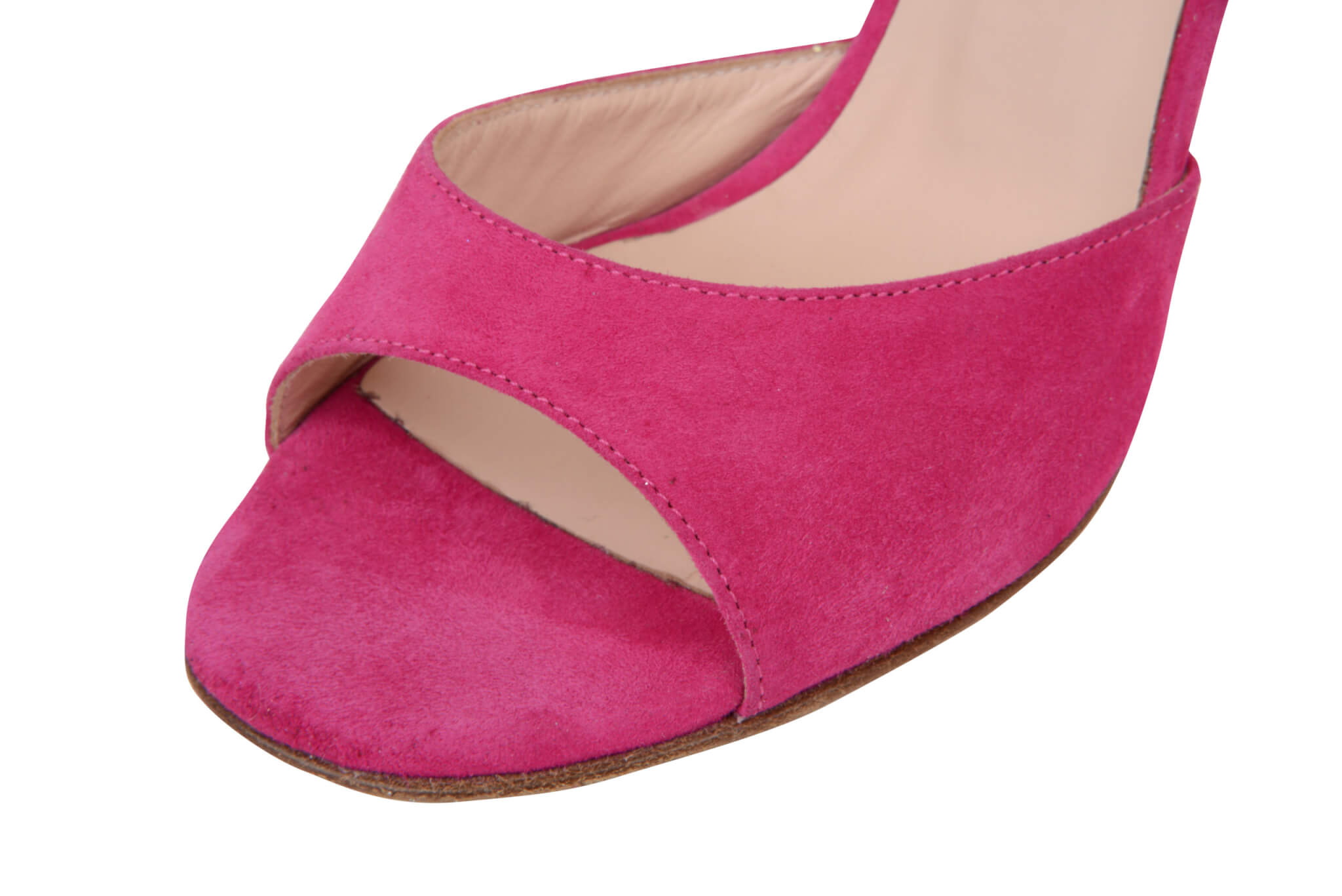 Excellent glitter combined with Fuxia suede leather, Open toe model with Closed heel cage, Double ankle strap, Shinny platina stiletto heel and fine leather sole.