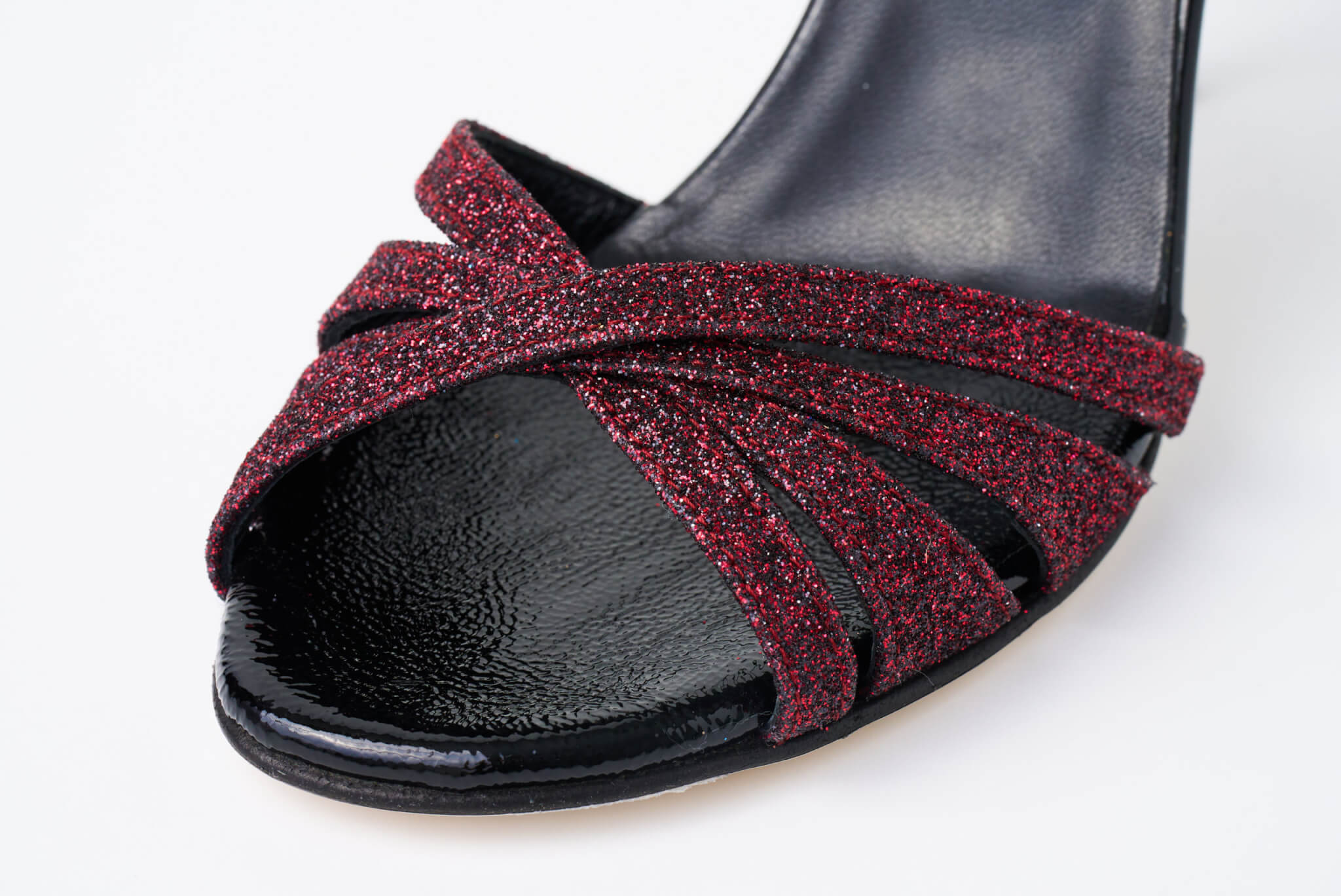 Bordo Colored Glitter, combined with Black Patent Leather, Open toe model with Closed heel cage, Double ankle strap, Black stiletto heel and fine leather sole.