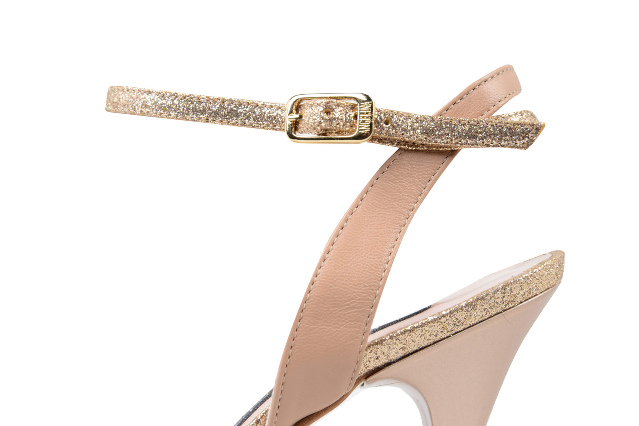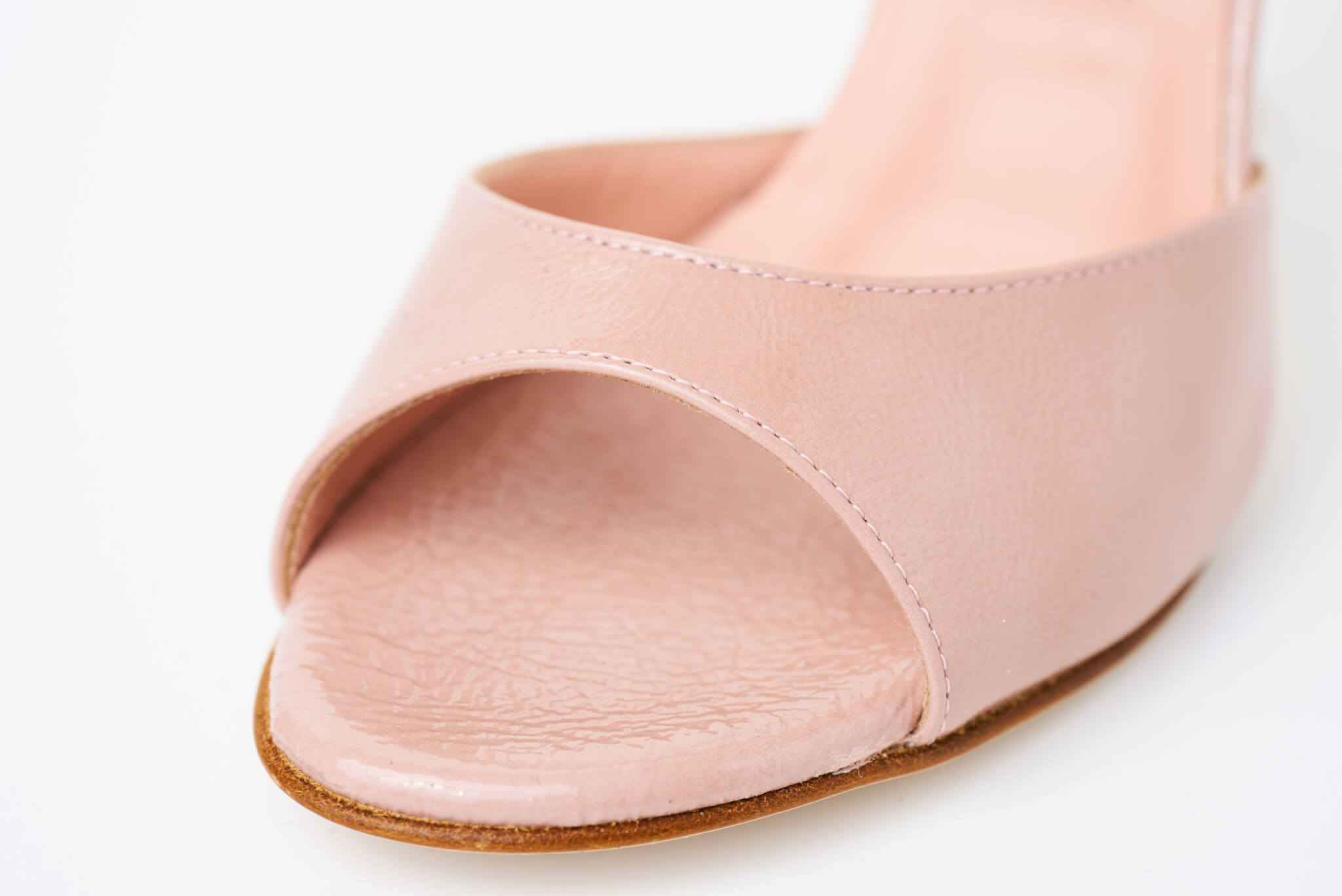 Pink-Nude Soft Patent Leather, Open toe model with Open heel cage, matching Double Ankle strap, Platina stiletto heel and fine leather sole.