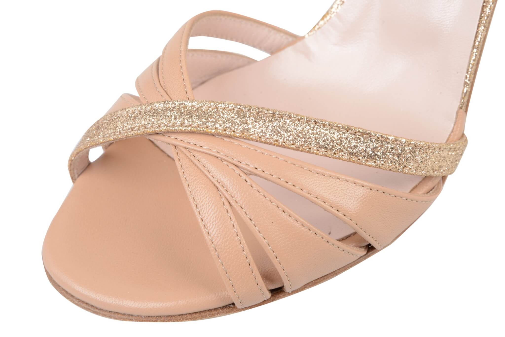 肌馴染みの良いキャメルベージュの上質な表革にピンクゴールドのラメをポイントにあしらった毎日履きたいオープンヒールモデル。同色のピンヒールに上質な革底を使用。