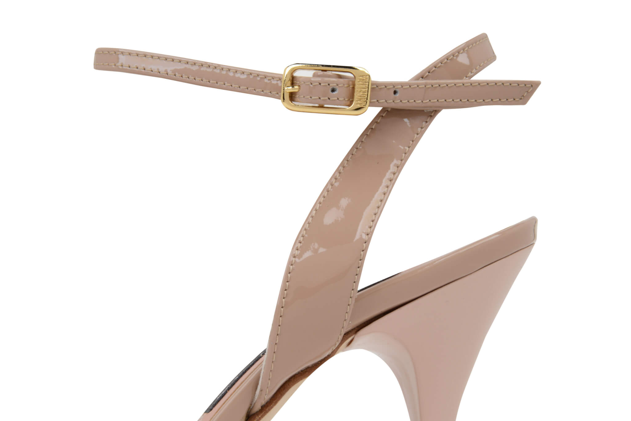 Nude color patent leather, Open toe model with Open heel cage, matching Single strap, Beige colored stiletto heel and fine leather sole.