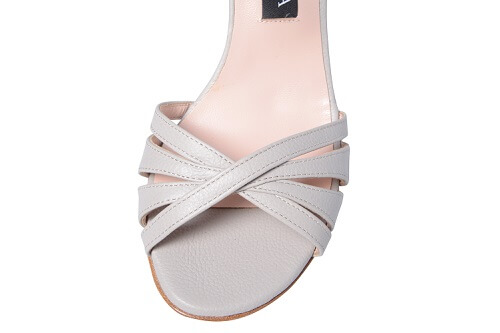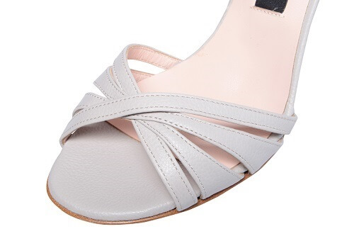 Grey-beige leather, Open toe strappy model with Closed heel cage, matching double ankle strap, Grey colored stiletto heel and fine leather sole.