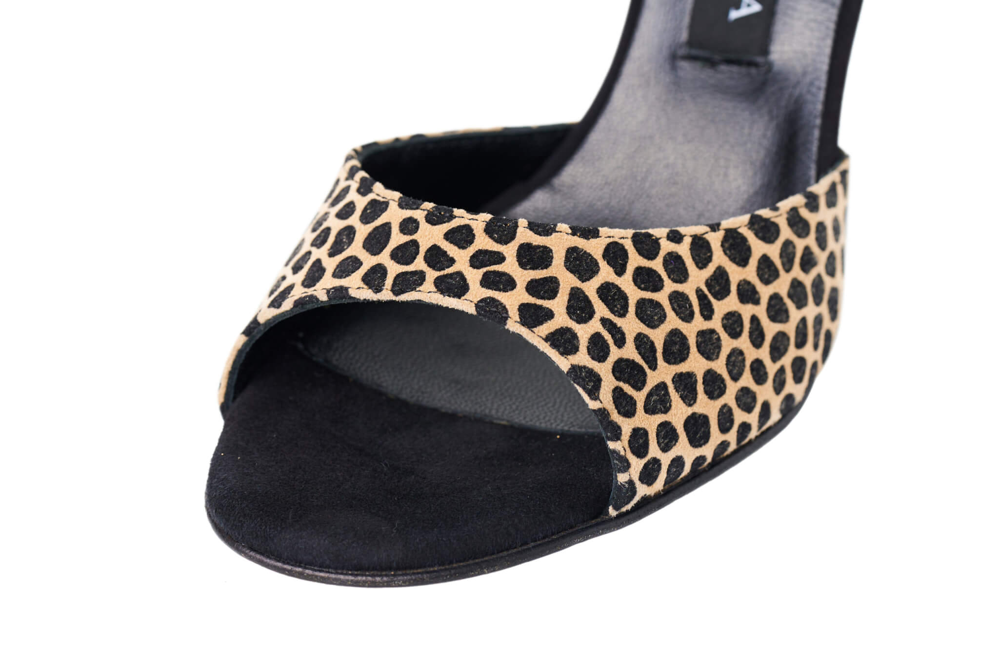 Elegant animal printed leather combined with fine black suede leather, Open toe model with Closed heel cage, Double ankle strap, Black stiletto heel and fine leather sole.