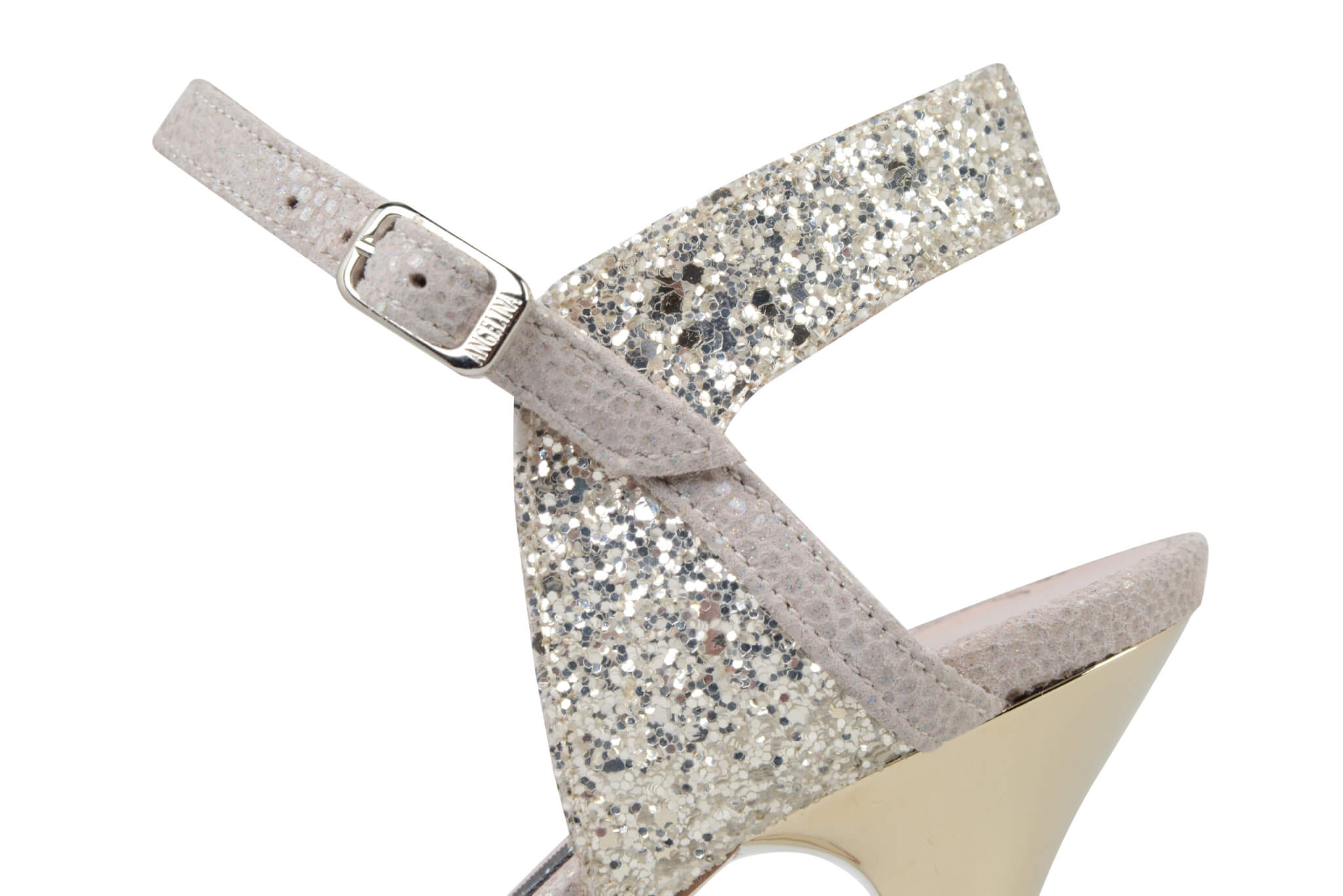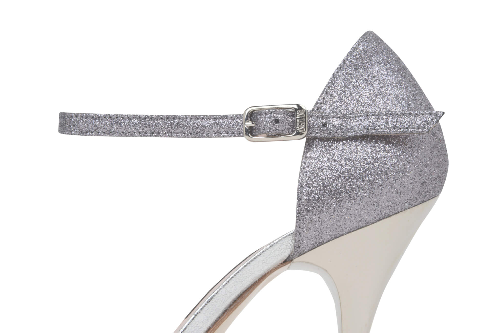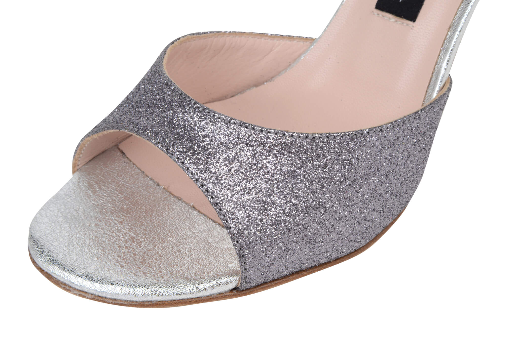 Pewter color glitter, combined with silver leather, Open toe model with Closed heel cage, Single ankle strap, Silver stiletto heel and fine leather sole.