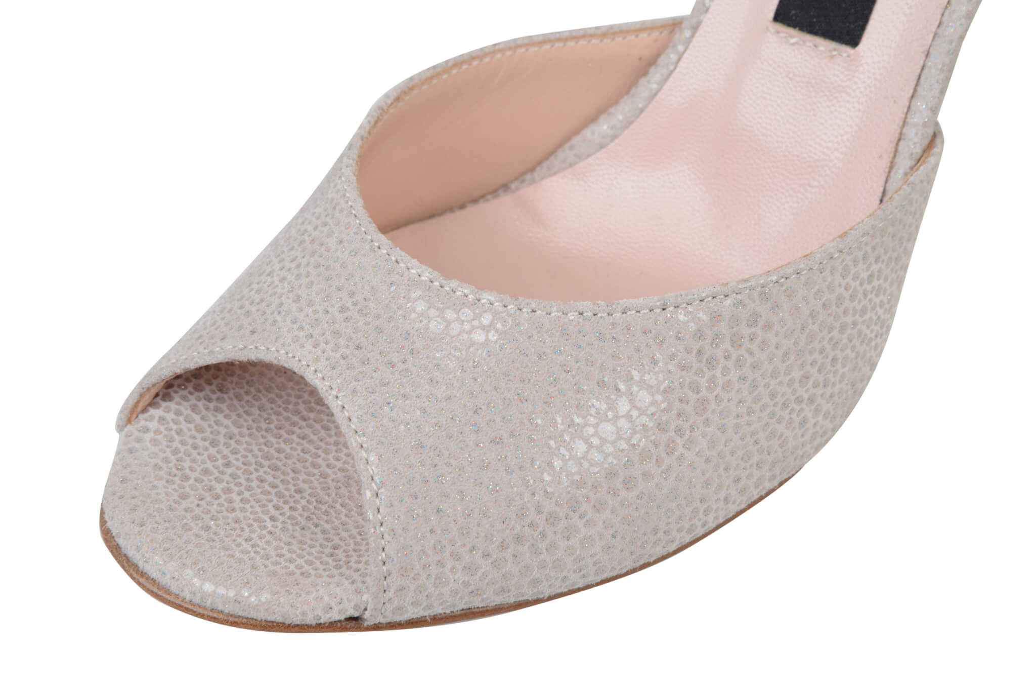 Shinny Silver Glitter combined with soft grey beige lather, Peep toe model, Open heel cage, matching single strap, Shinny Silver stiletto heel and fine leather sole.