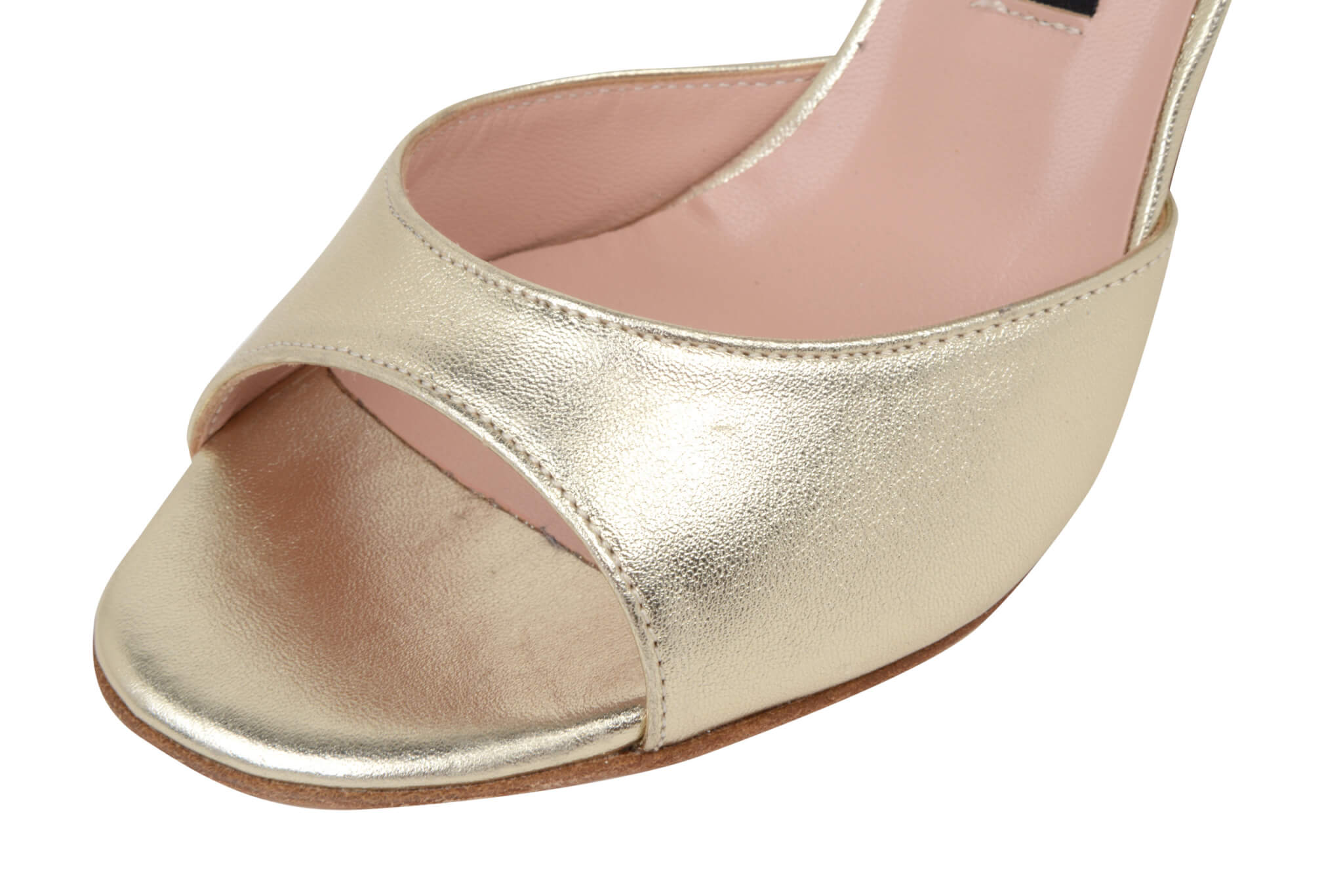 Plain platina leather, Open toe model with Closed heel cage, Single ankle strap, Shinny platina gold stiletto heel and fine leather sole.