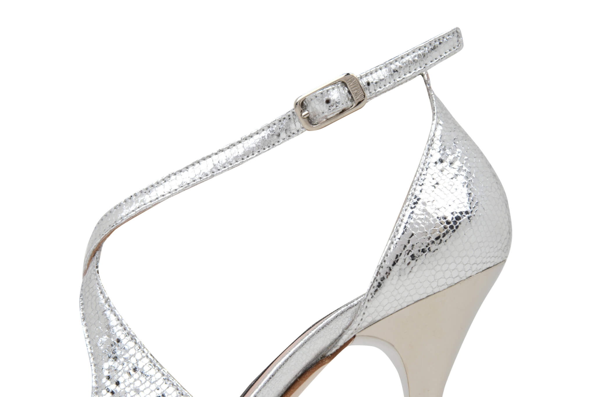 Shinny silver printed leather, open toe “Georgi” model with closed heel cage, matching Cross strap on instep, Shinny silver stiletto heel and fine leather sole.