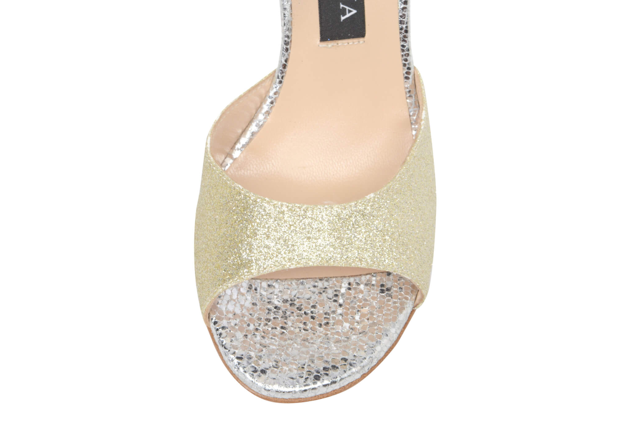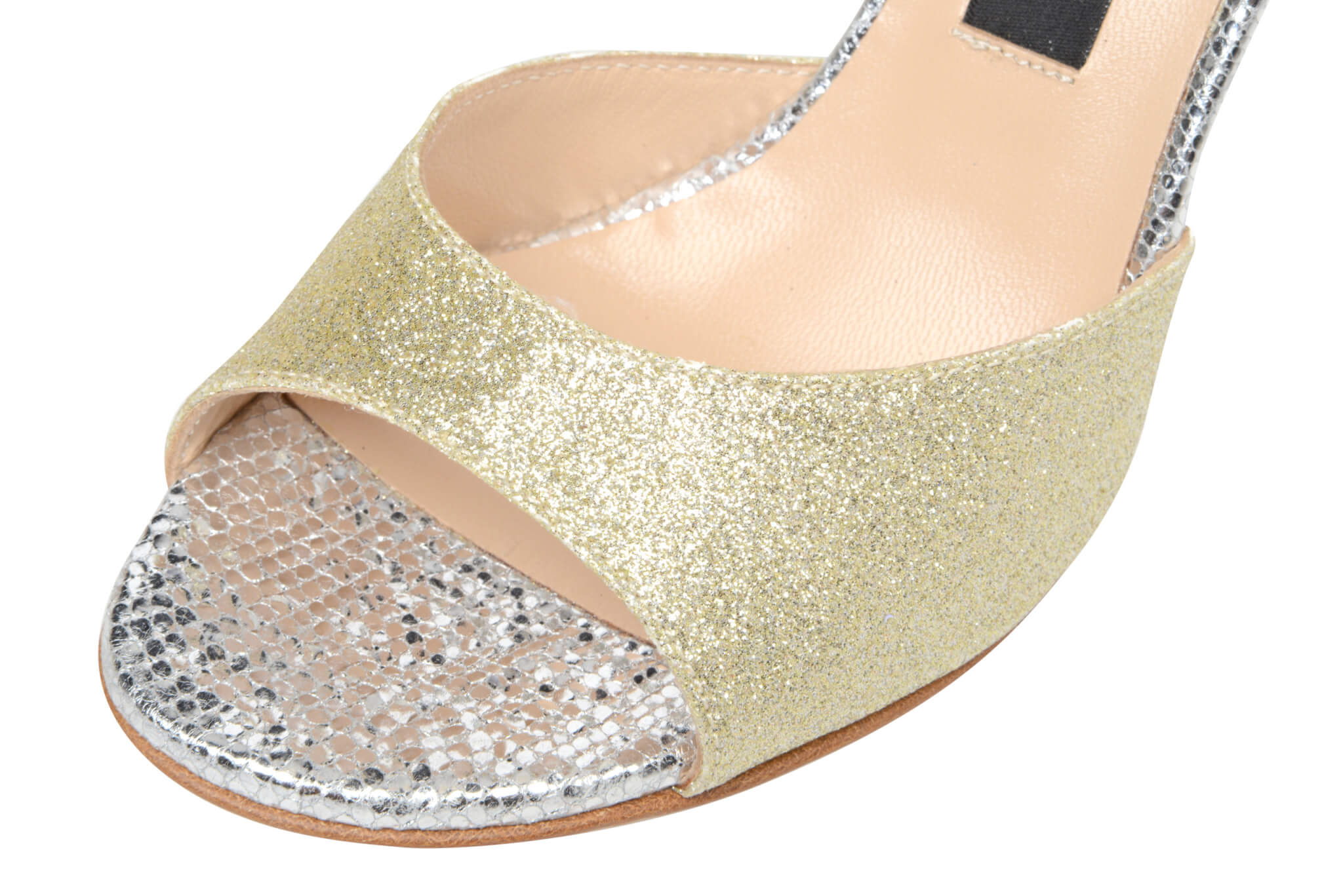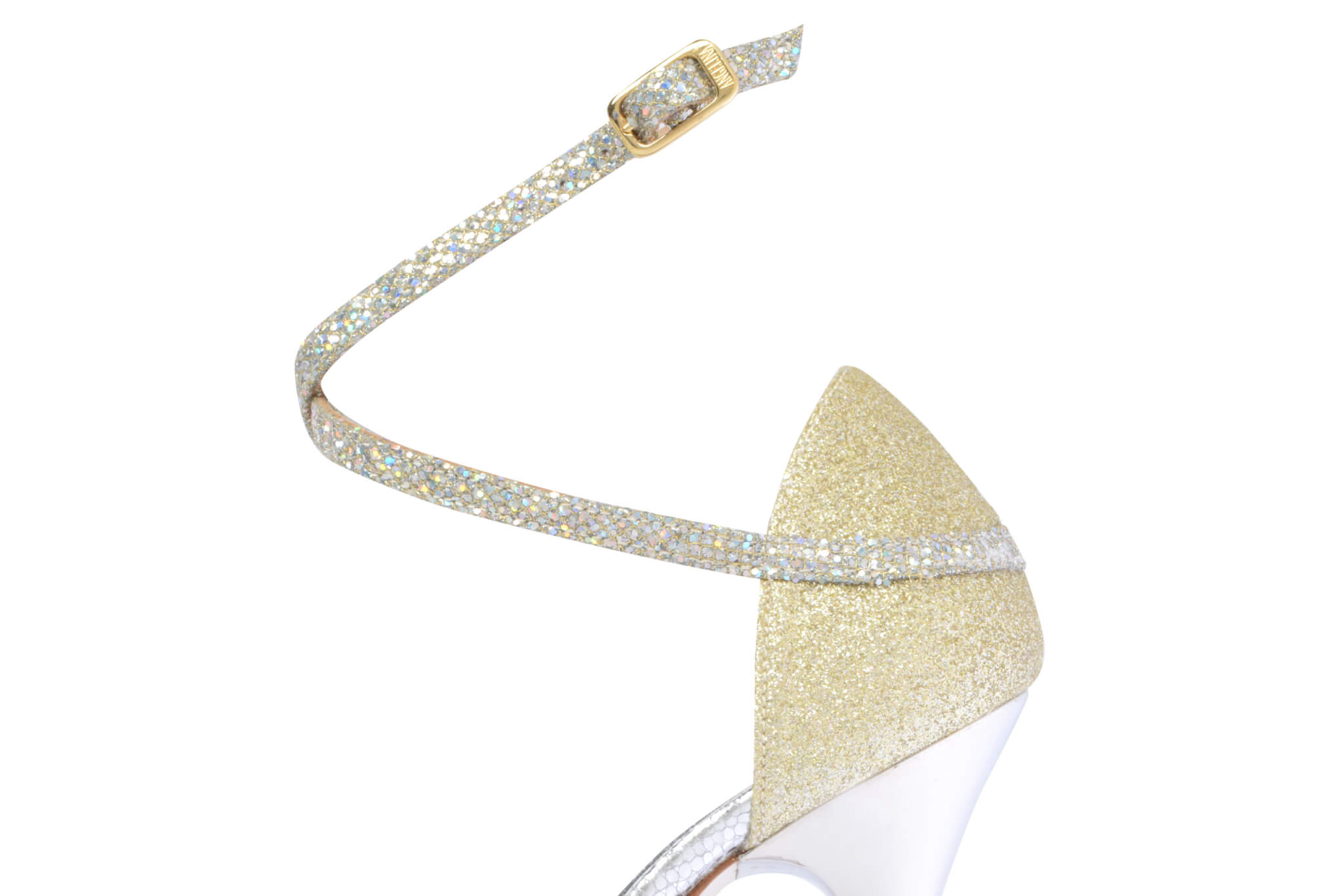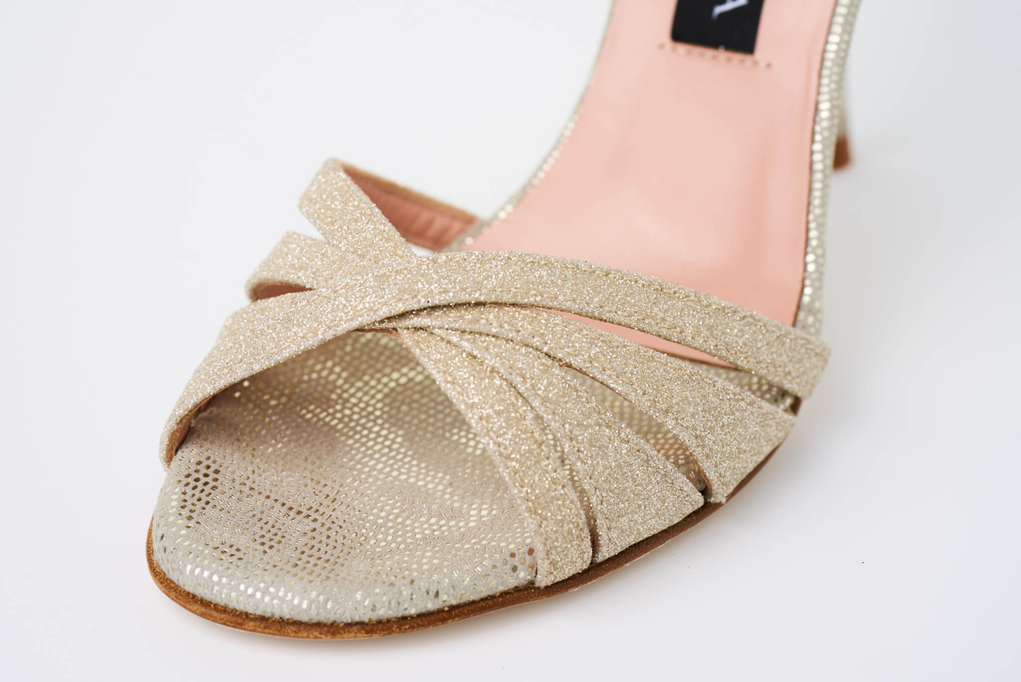 Shinny Platina gold glitter, Open toe model with Closed heel cage, Double ankle strap, Shinny Silver stiletto heel and fine leather sole.