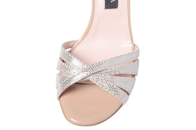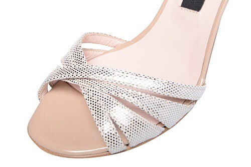ラメのように輝く加工したシルバーの革を惜しみなく使った、安定感のある甲でクロスするセクシーなモデル。シルバーのピンヒールに上質な革底を使用。