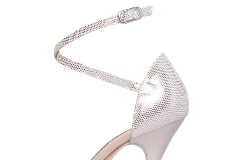 ホワイトシャンパンのの上品なラメと型押し革を合わせた、特別な日に足元を輝かせてくれる1足。シルバーのピンヒールに上質な革底を使用。