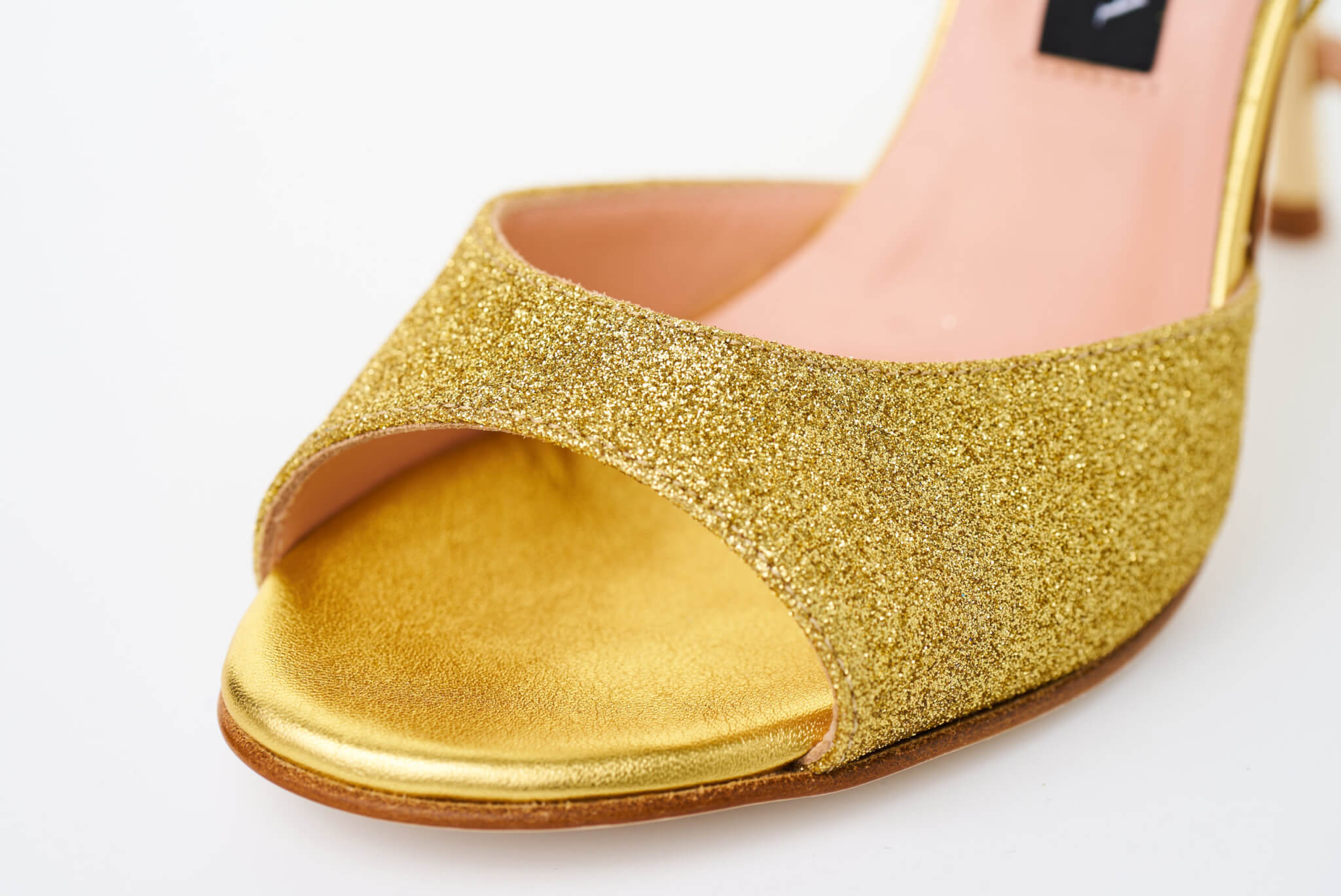 Shinny Yellow Gold glitter, Combined with fine gold leather, Open toe model with Open heel cage, Double ankle strap, Shinny Gold stiletto heel and fine leather sole.