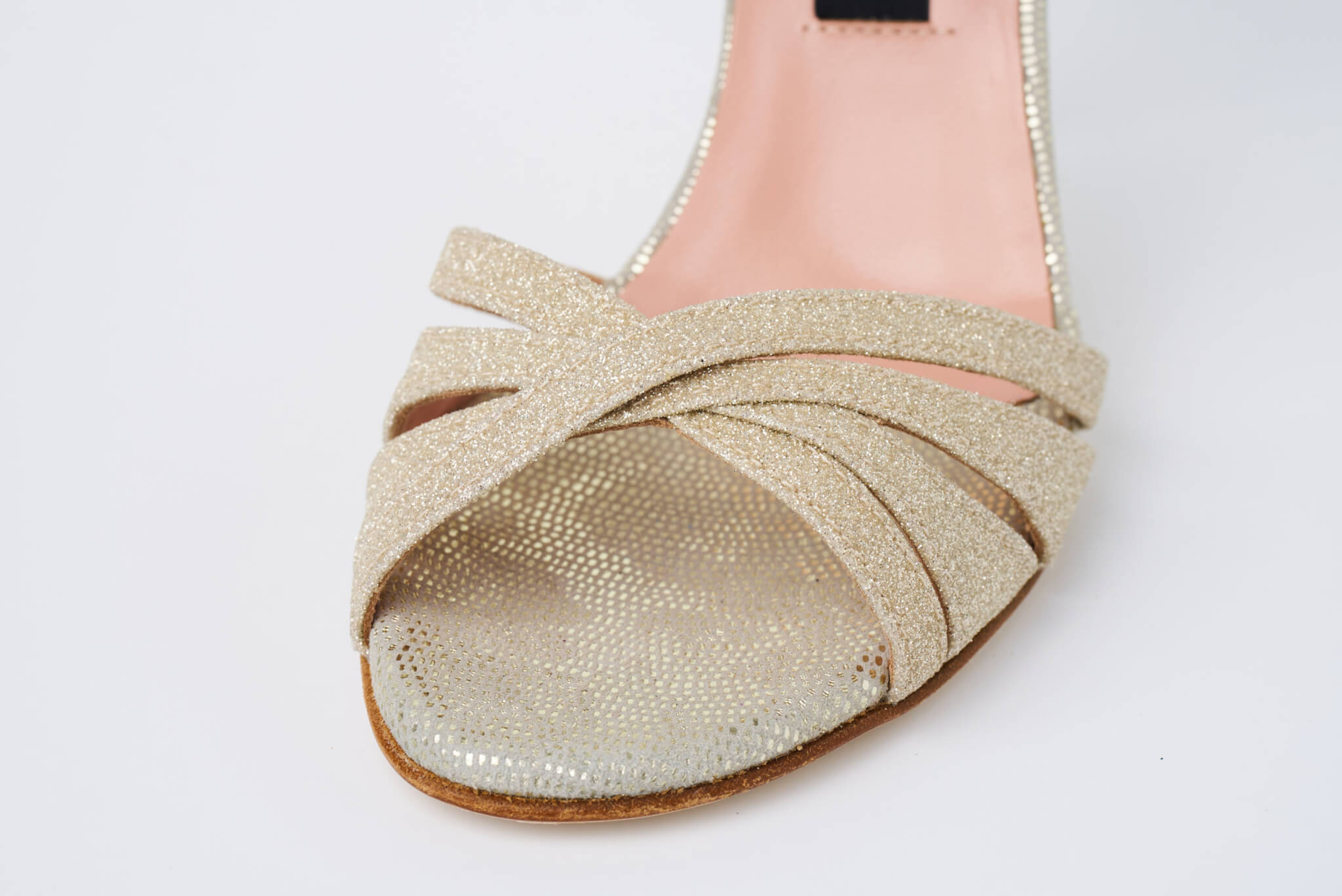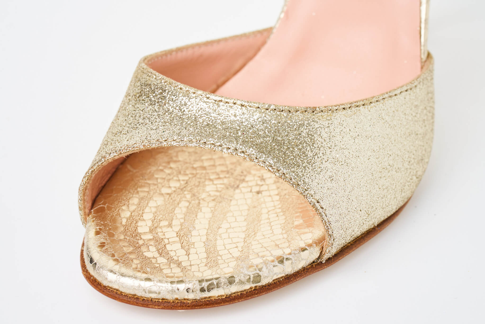 Shinny Platina gold glitter, Combined with gold printed leather, Open toe model with Closed heel cage, Double ankle strap, Shinny Gold stiletto heel and fine leather sole.